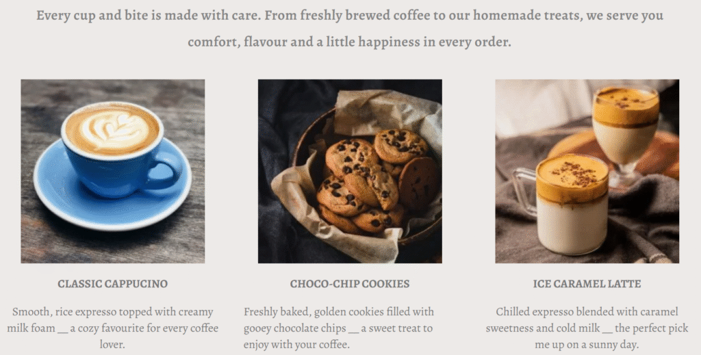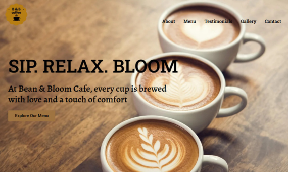 A clean, modern one-page coffee shop website with interactive sections and responsive design. Built with WordPress and Elementor, it highlights menu items and an engaging user experience. Each section is thoughtfully designed to capture the cafe’s vibes, with clear navigation and call to action elements. Perfect for small businesses wanting a professional online presence that is easy to manage and visually appealing.